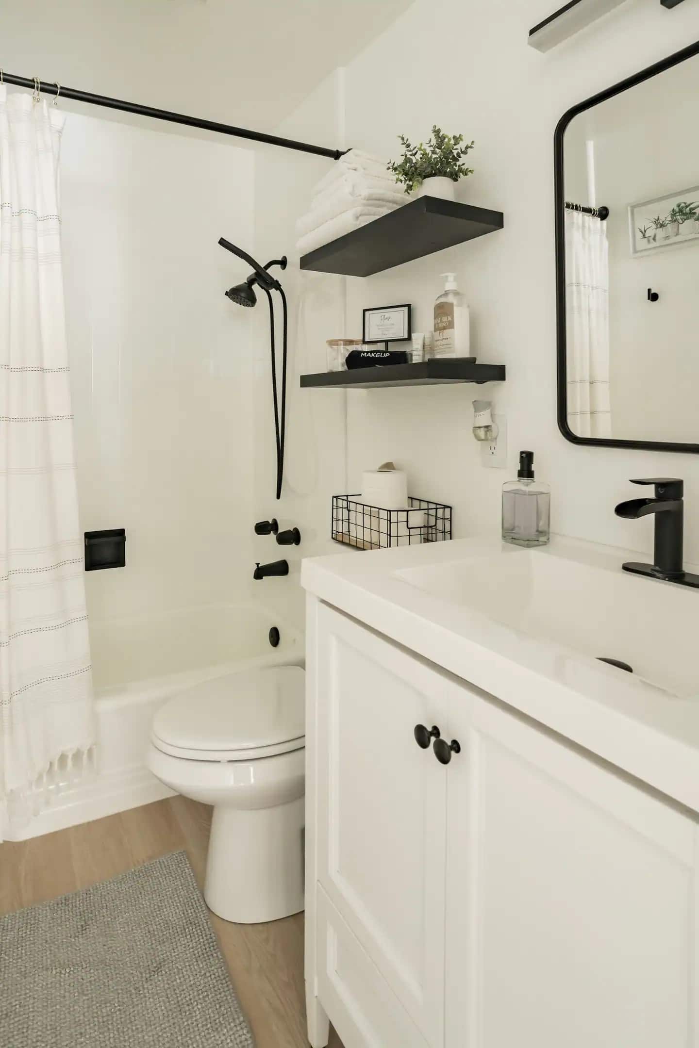BATHROOM: All new fixtures and vanity. Features a full size bathtub, Waterpik showerhead with body wand, large sink, and ample storage. We provide the standard amenities here: shampoo, conditioner, body wash, cotton swabs and linens.