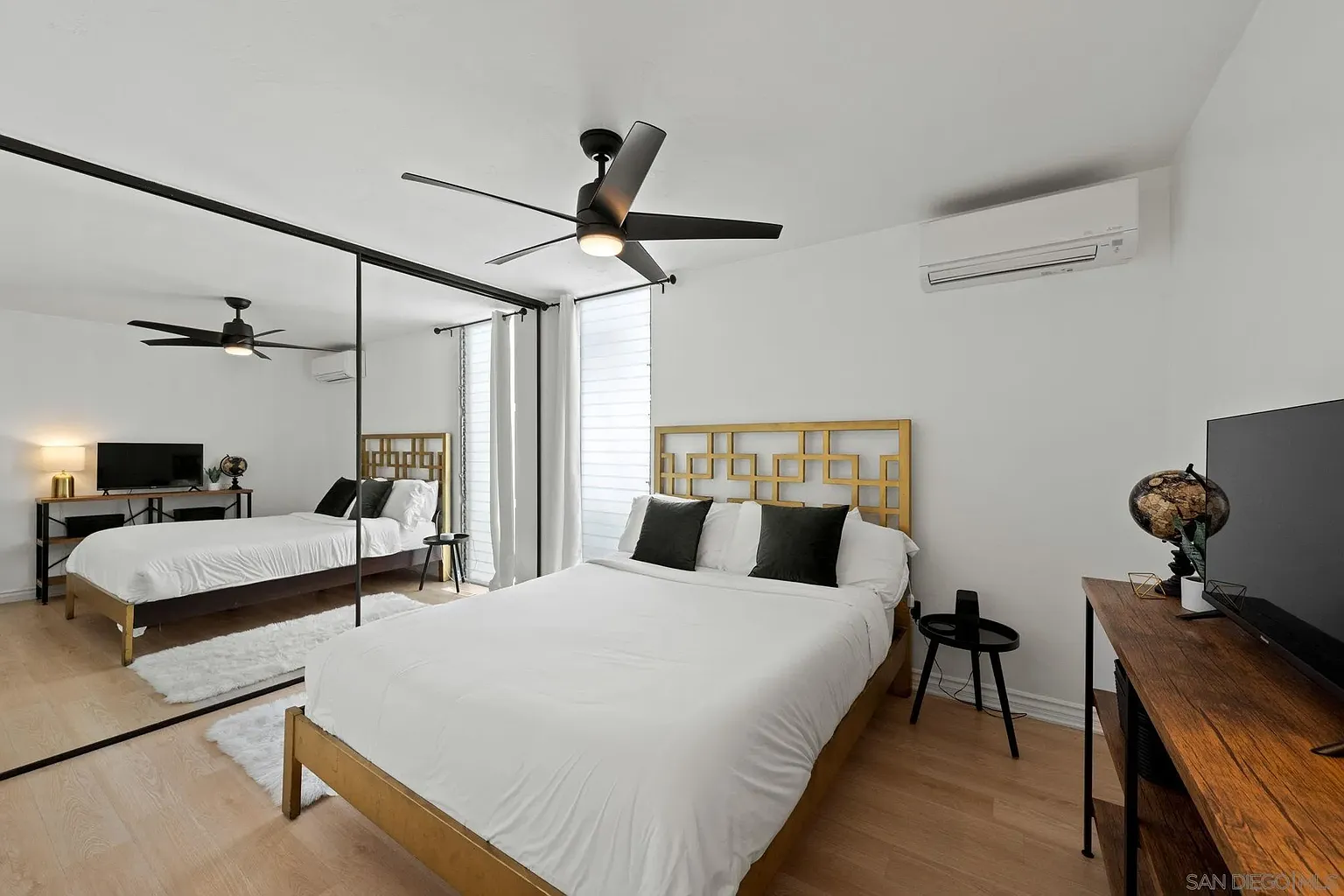 MAIN BEDROOM: Offers a Queen bed, nightstand, Roku TV, ceiling fan, one mini-split AC/Heat unit, and large closet. There is ample space in this room for a pack-n-play or crib.