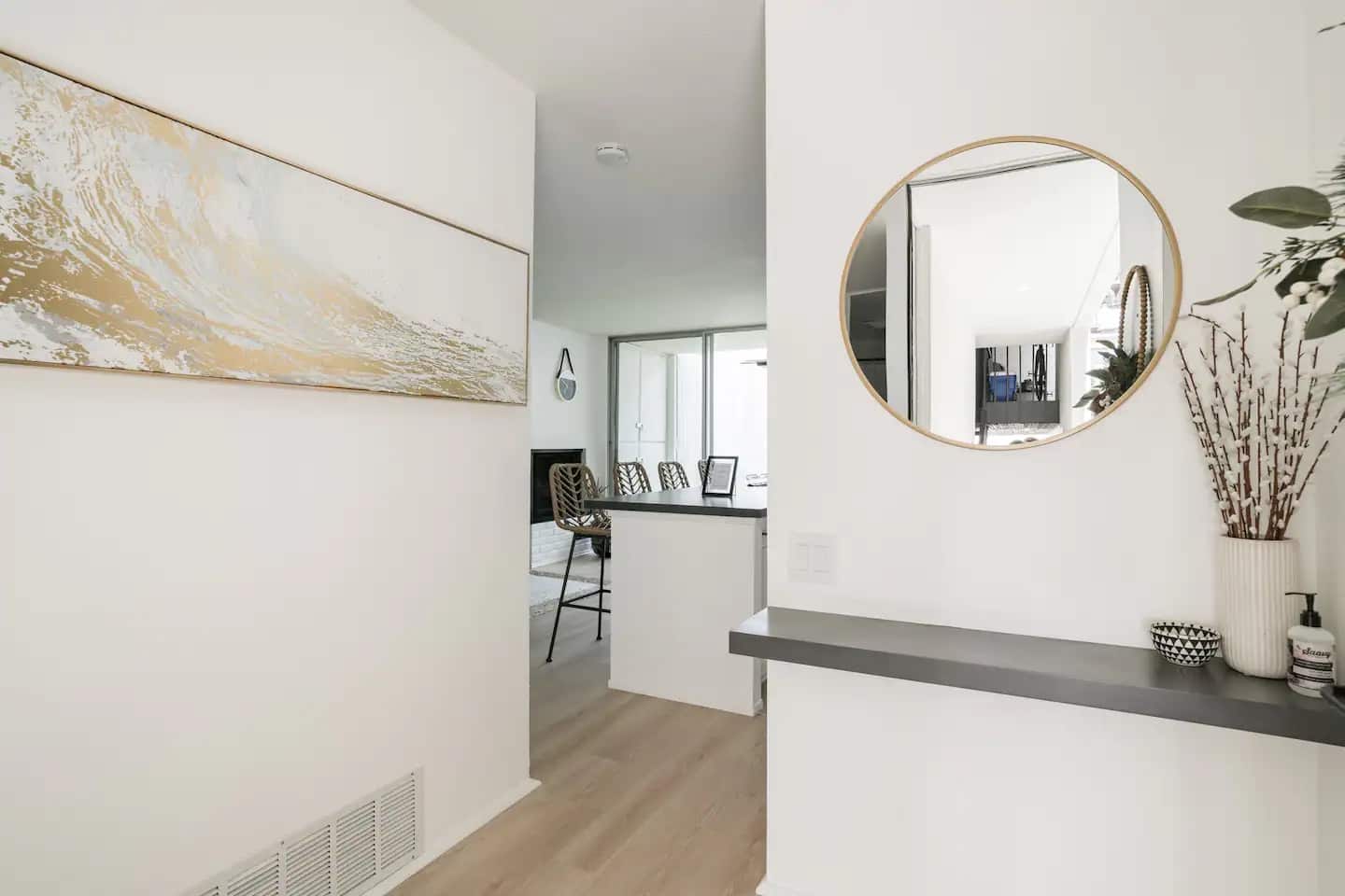 LIVING ROOM: The living space is open yet cozy, with a swivel 48in TV, couch, and convertible coffee table (you can use the top as a tray and fold up the legs). We have one mini-split AC/Heat unit located in this space. Our favorite part: floor to ceiling sliding glass doors that lead to the 200 sq. ft. private patio. Please note: the fireplace is ornamental only.