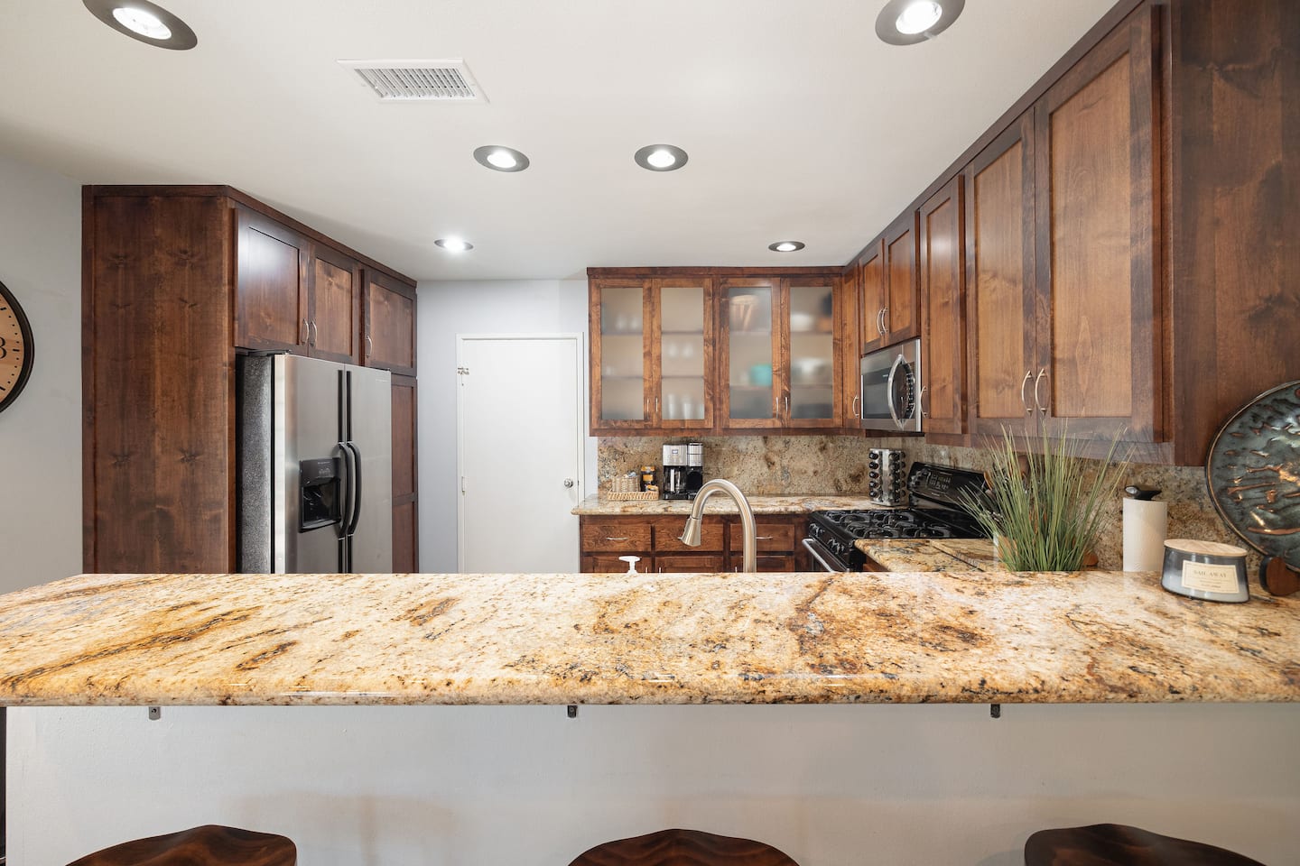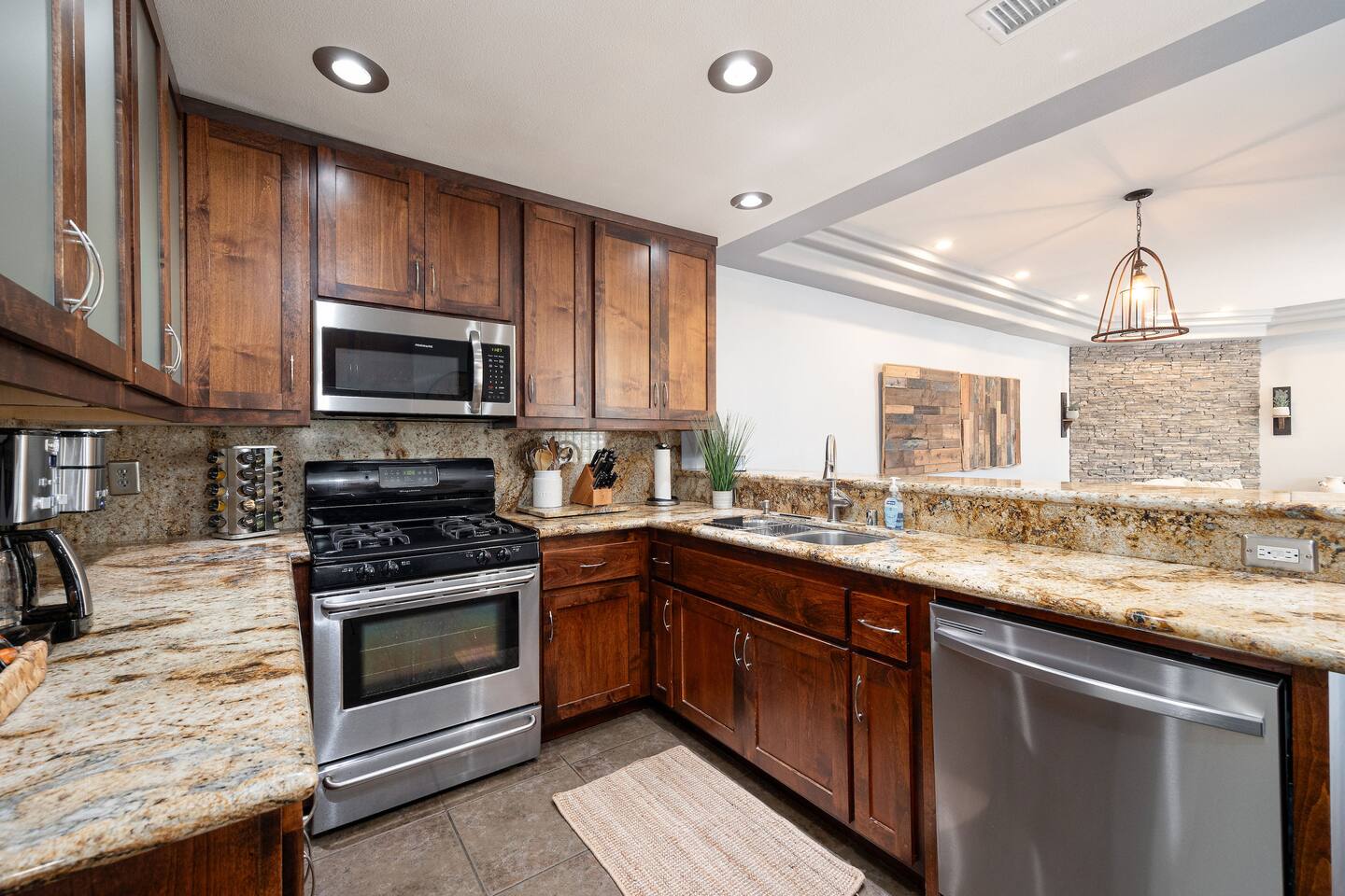 Fully equipped kitchen with pots, pans, dishes, glassware, wine glasses, silverware, coffee pot, Keurig, toaster and more. We have everything you need to prepare meals or BBQ. We provide coffee (regular & decaf), teas, creamer and sugars.