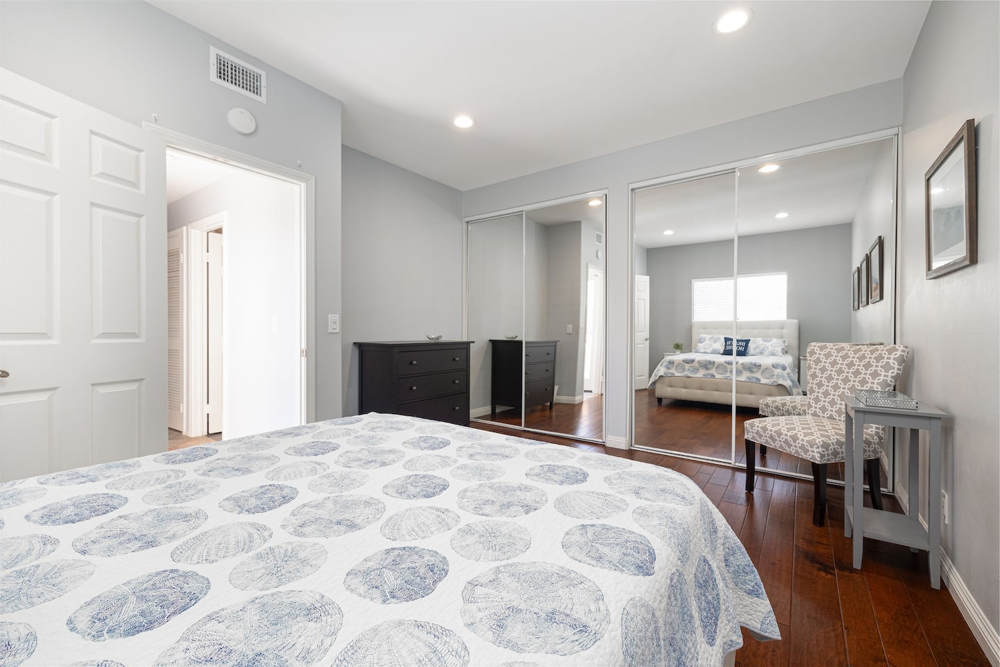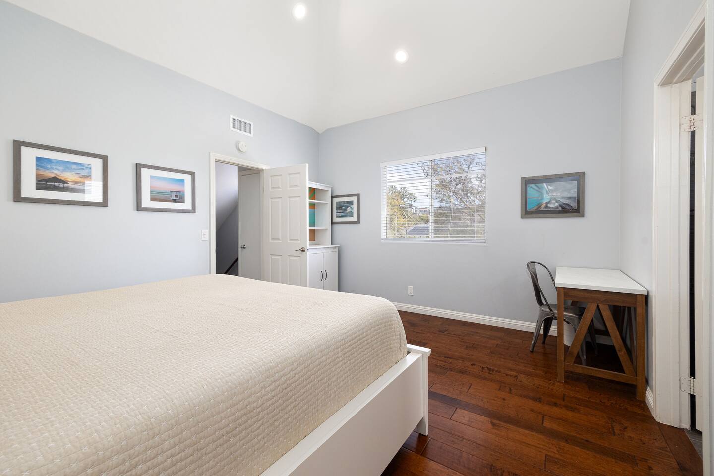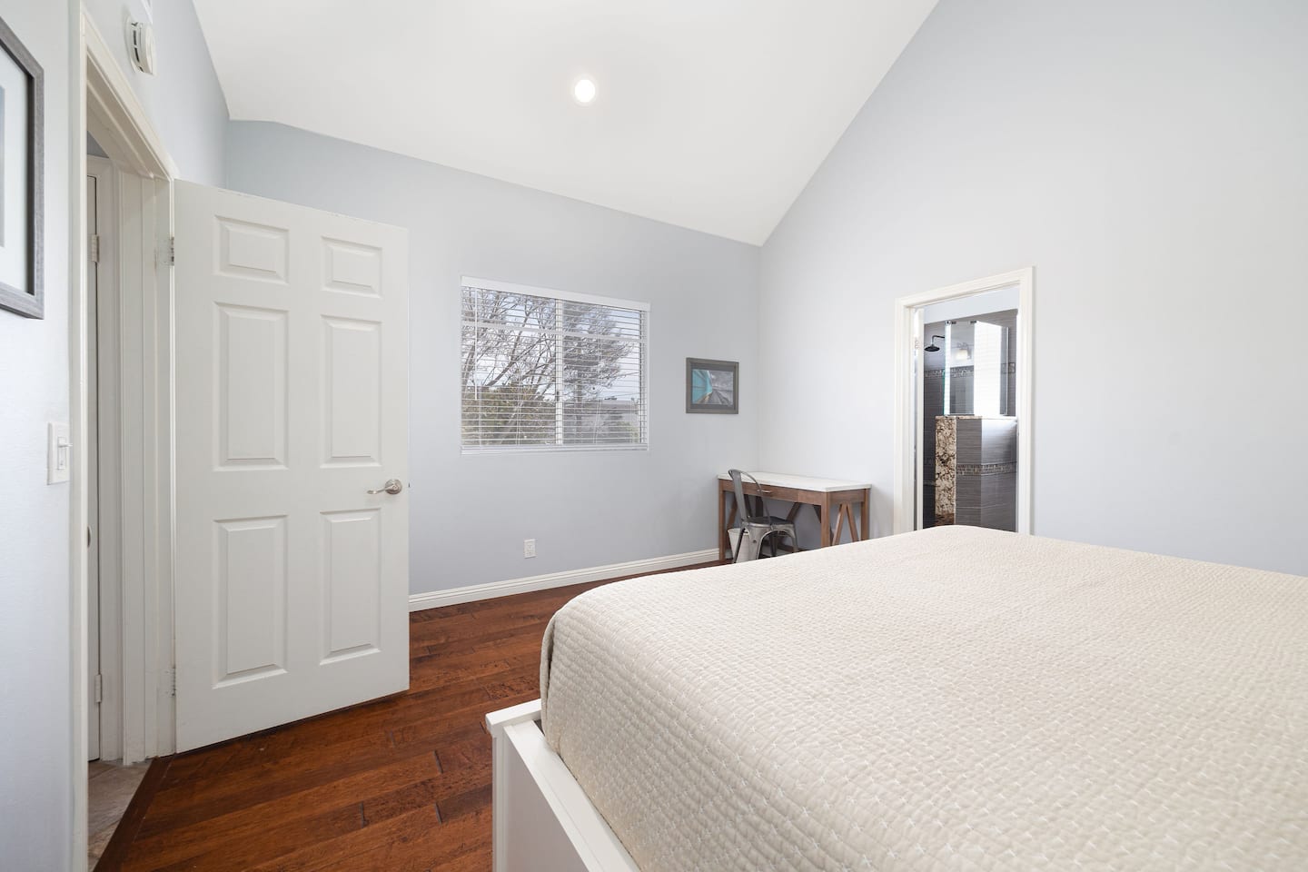 The master bedroom has a king bed and a private en-suite bathroom.