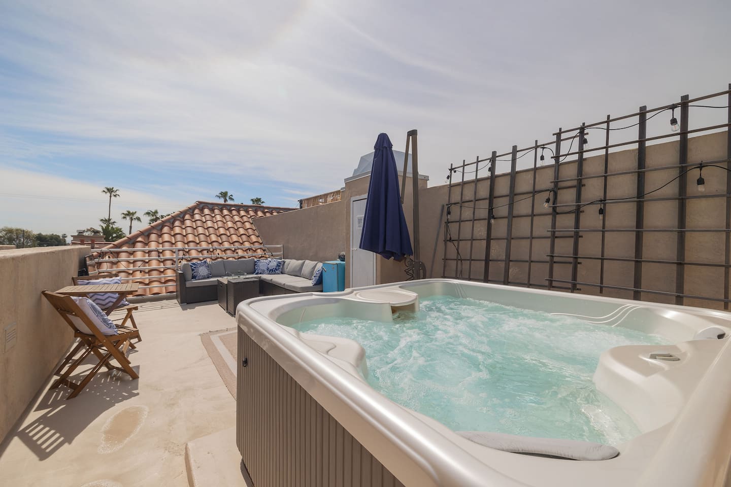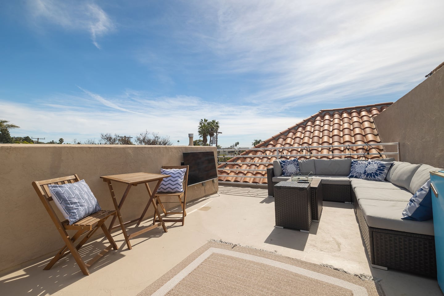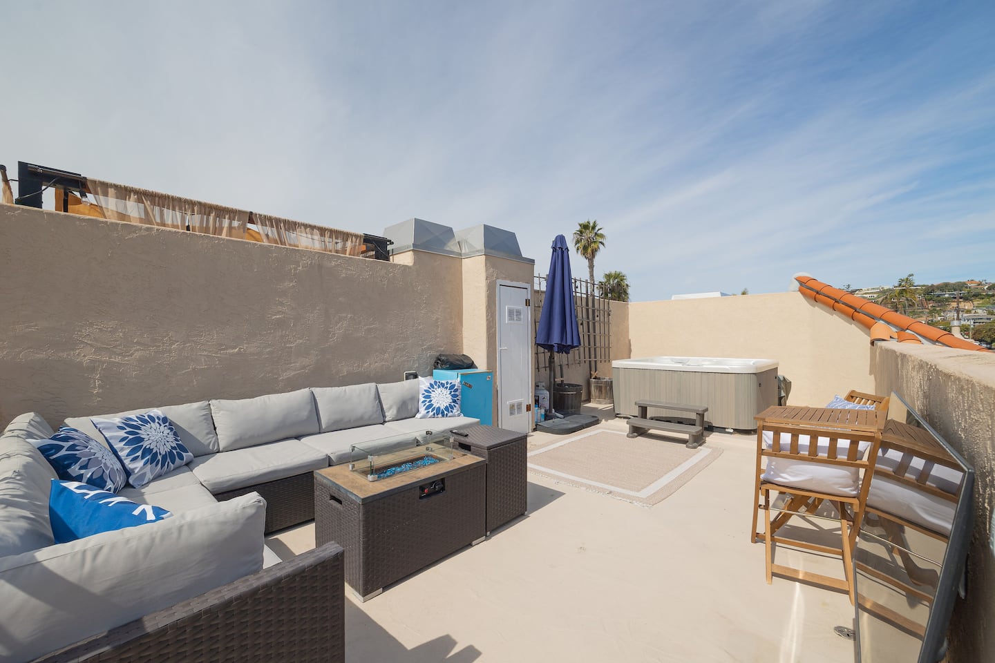 This two-story modern townhome is your ideal San Diego retreat, perfectly situated in the highly sought-after North Pacific Beach neighborhood. You'll be just four blocks from the ocean and a short walk from the area's best restaurants, cafes, and nightlife. The home's highlight is the rooftop deck, which offers the ultimate space for relaxation and entertainment. It features a hot tub, comfortable outdoor seating, a cafe table, a flat-screen TV, and a mini-fridge.